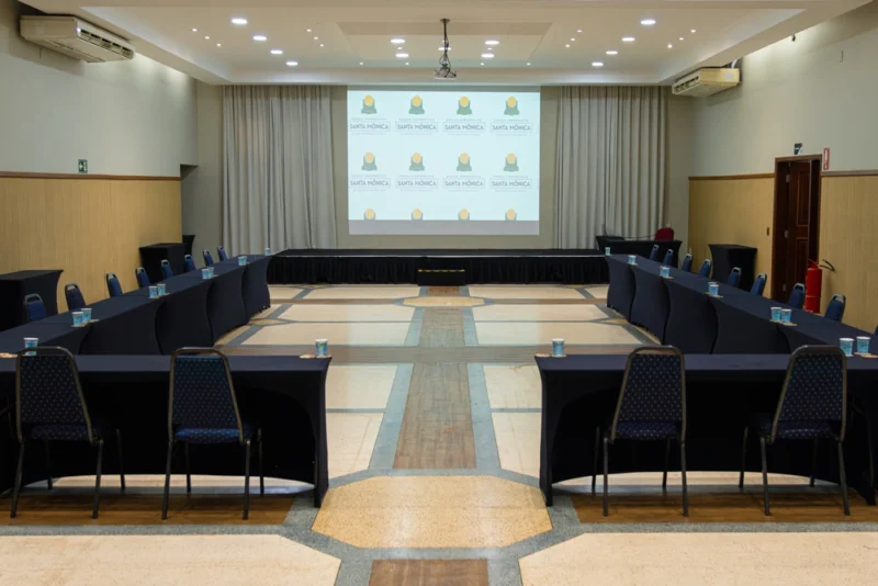 Sala com capacidade para até 480 pessoas em formato de auditório com pé direito de 4,80m telão de projeção ou tela LED de 1.000”